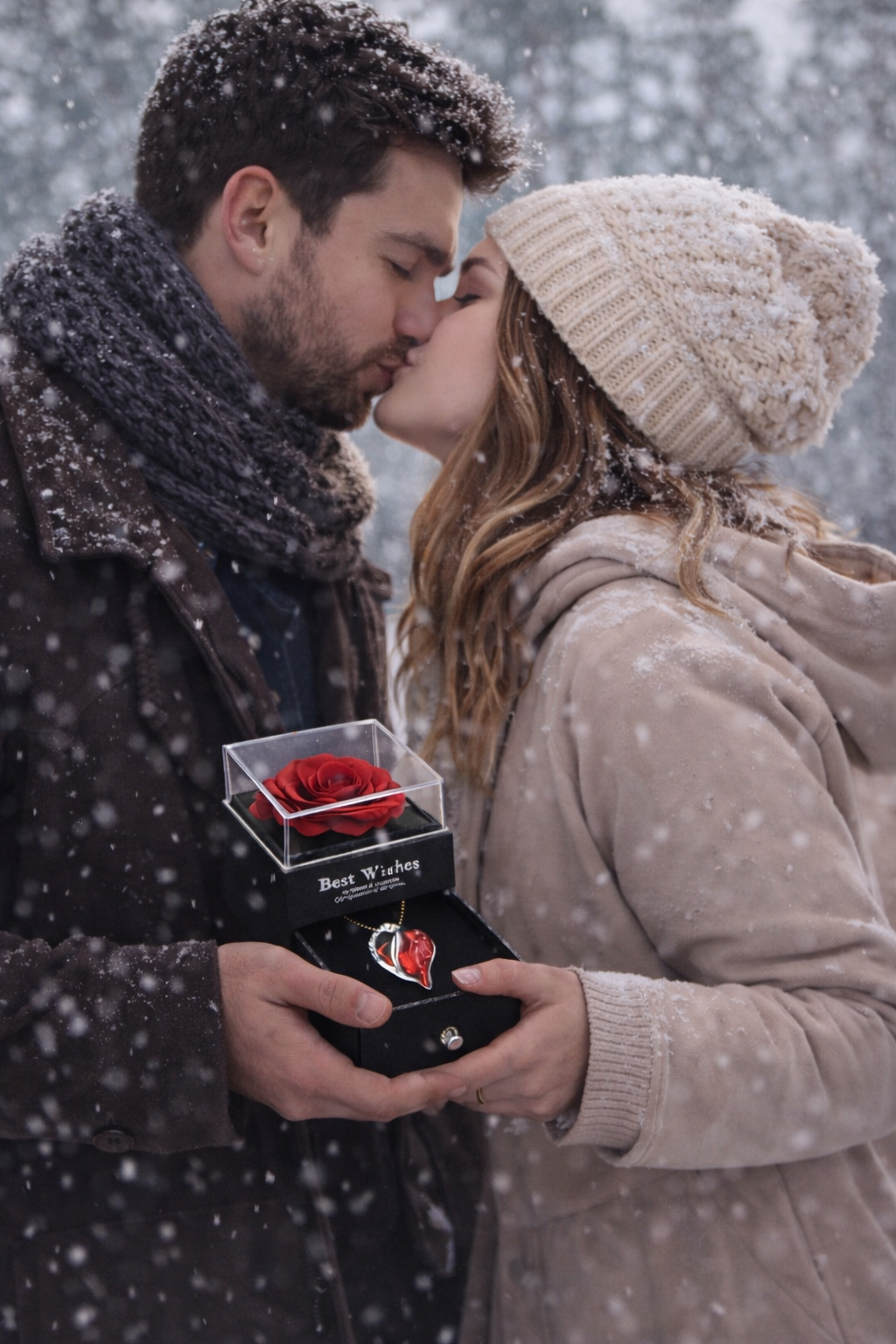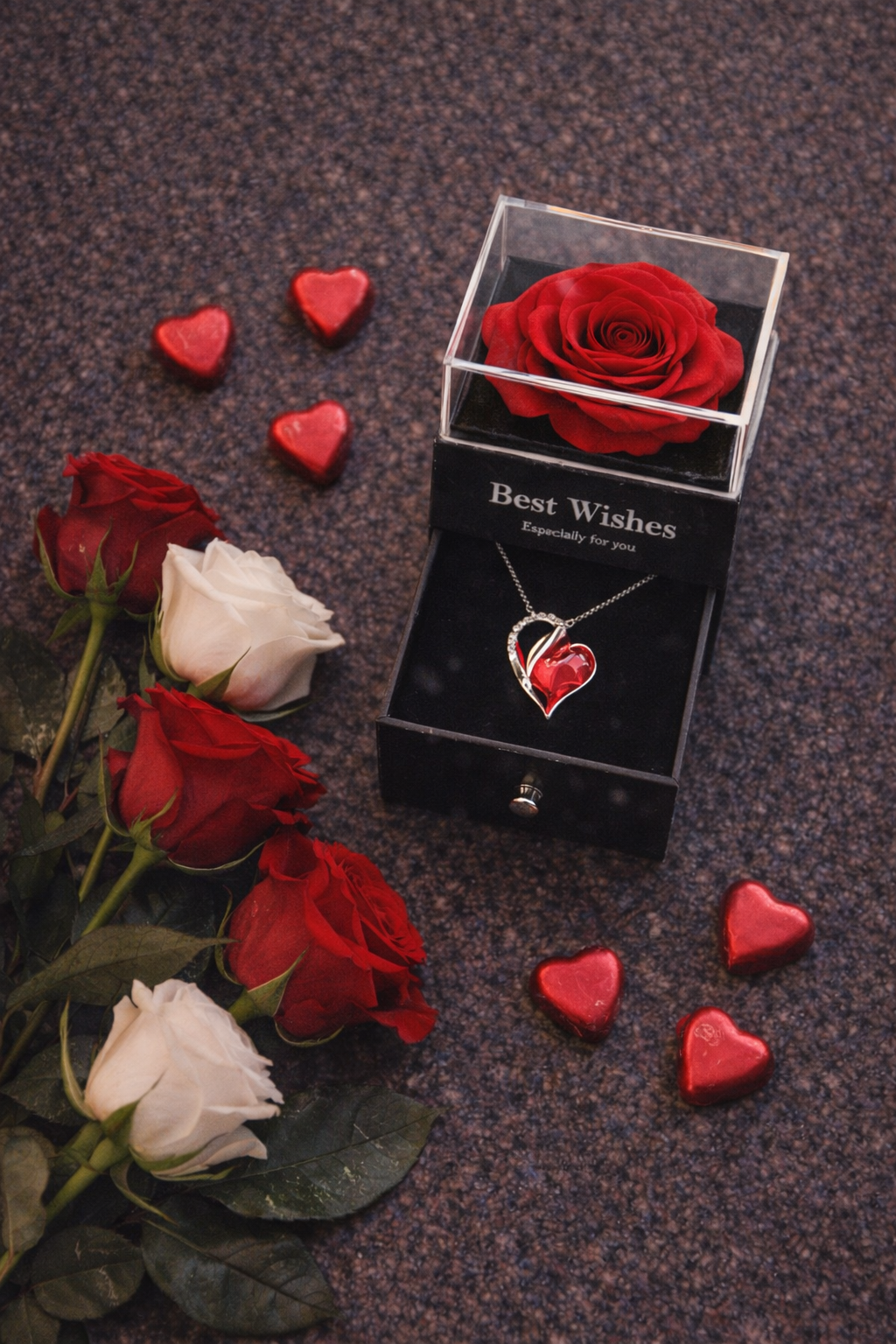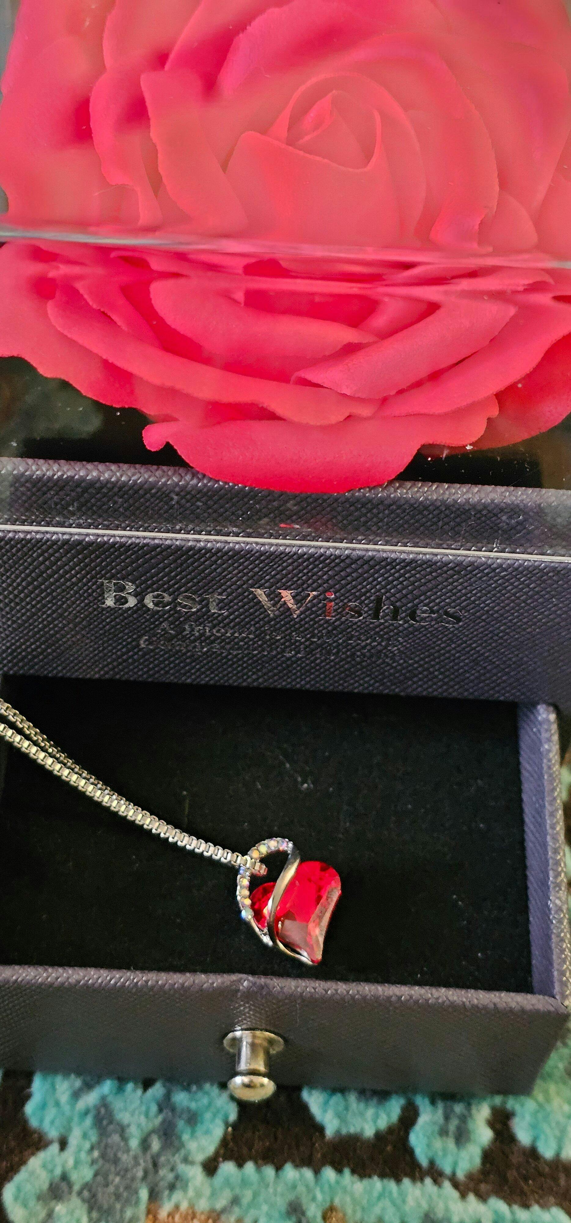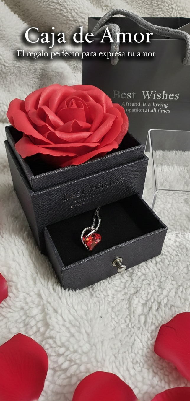 La Caja de Amor combina un elegante collar en forma de corazón con una rosa eterna, símbolo de un amor que no se marchita con el tiempo.